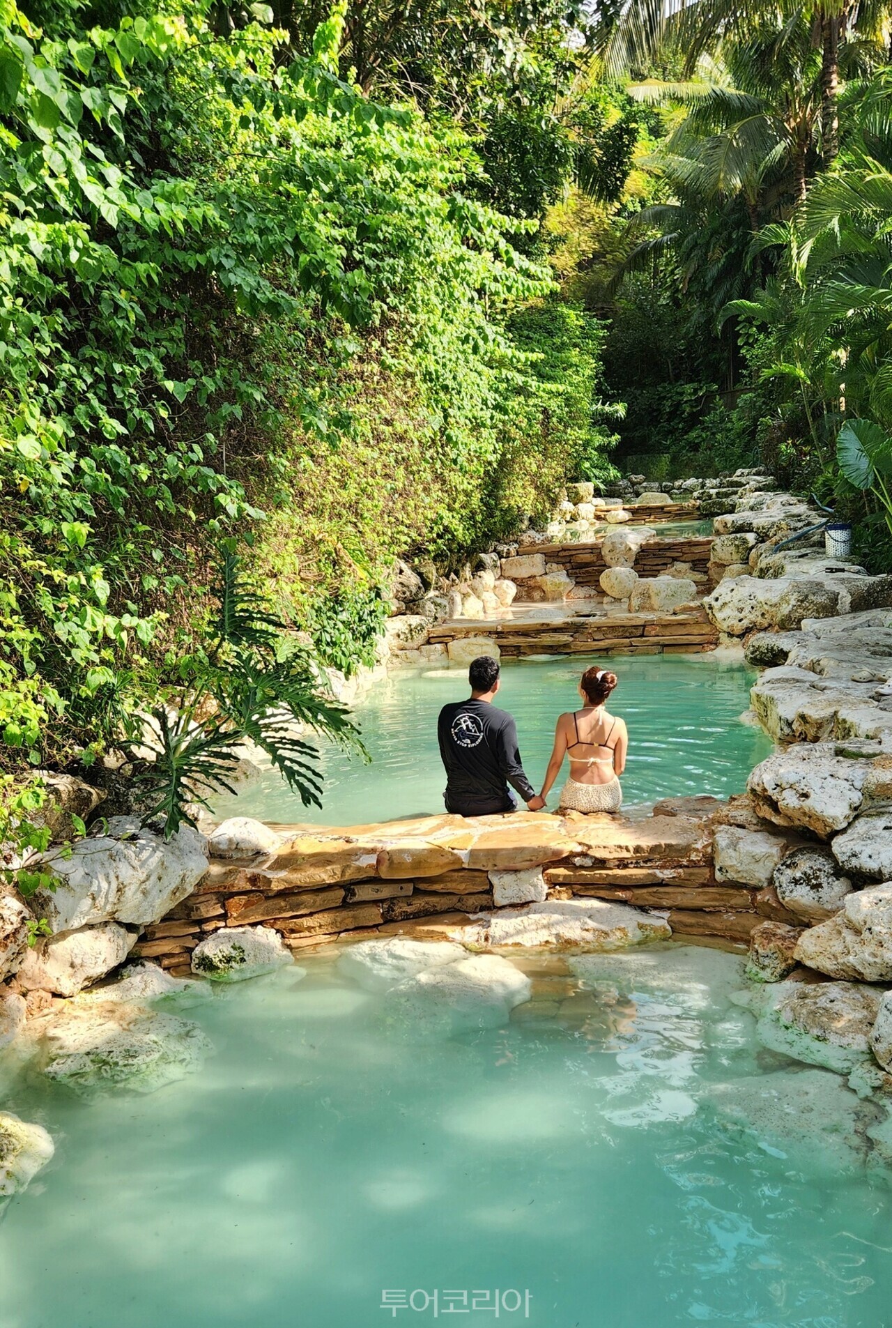 메인 풀장에서 바다쪽과 반대쪽으로 가면 동화 속에 나오는 숲 속 마을같은 라군 풀장이 나온다. 계단식 논처럼 층층이 하얀 테두리에 에메랄드빛 물빛이 예술이다. 여기를 배경으로 찍는 인증샷은 그 자체로 화보가 된다.